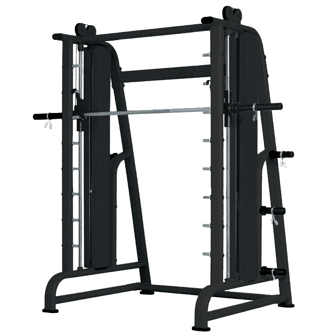 Attrezzo multiuso che consente di eseguire in maniera guidata numerosi esercizi per gli arti superiori ed inferiori. Il bilanciere scorre su due binari perpendicolari al terreno. Su di esso vengono caricati i dischi che forniscono la resistenza dell’esercizio.